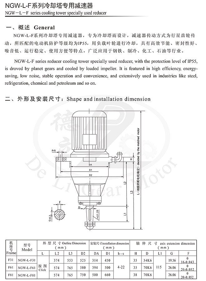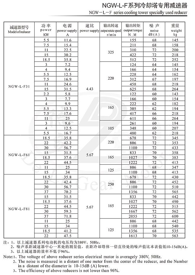 NGW-L-F系列冷卻塔專用減速器系上海交通大學(xué)設(shè)計(jì),是專門為配套200~750T/n冷卻塔設(shè)計(jì)的新產(chǎn)品,其主要結(jié)構(gòu)為立式單級行星傳動。齒輪采用合金鋼經(jīng)高精度切削加工熱處理而成,具有強(qiáng)度高、韌性好、精度高等優(yōu)點(diǎn),同時采用浸油式潤滑,且在密封方面作了改進(jìn),從而達(dá)到了噪音低、振動小、效率高、不漏油、壽命長的目的。己成為冷卻塔節(jié)能降噪的最理想產(chǎn)品,被廣泛用于化工、輕工、醫(yī)藥、冶金、高級賓館、民用建筑等行業(yè)。